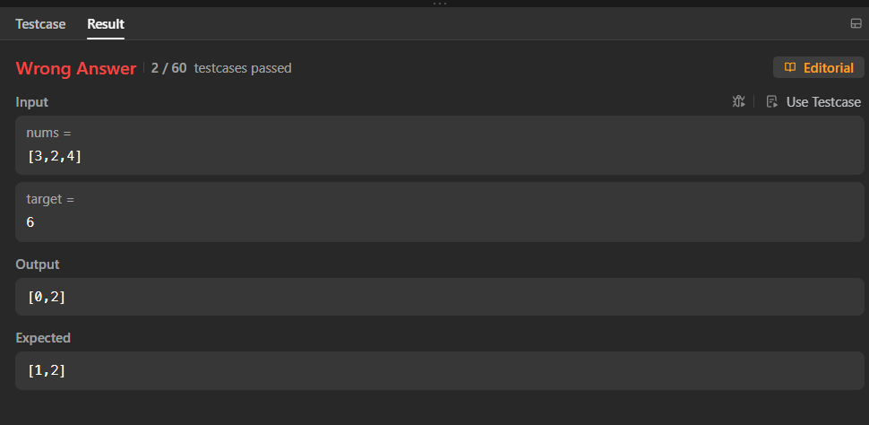 int 배열이 주어지고 target이 주어지면 2개의 조합으로 target이 되는 조합을 반환하는 문제입니다.