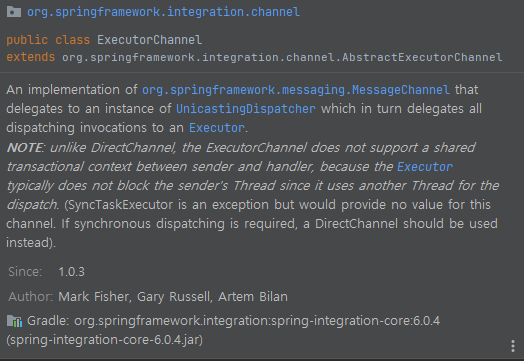 unlike DirectChannel, the ExecutorChannel does not support a shared transactional context between sender and handler, because the Executor typically does not block the sender's Thread since it uses another Thread for the dispatch. (SyncTaskExecutor is an exception but would provide no value for this channel. If synchronous dispatching is required, a DirectChannel should be used instead).